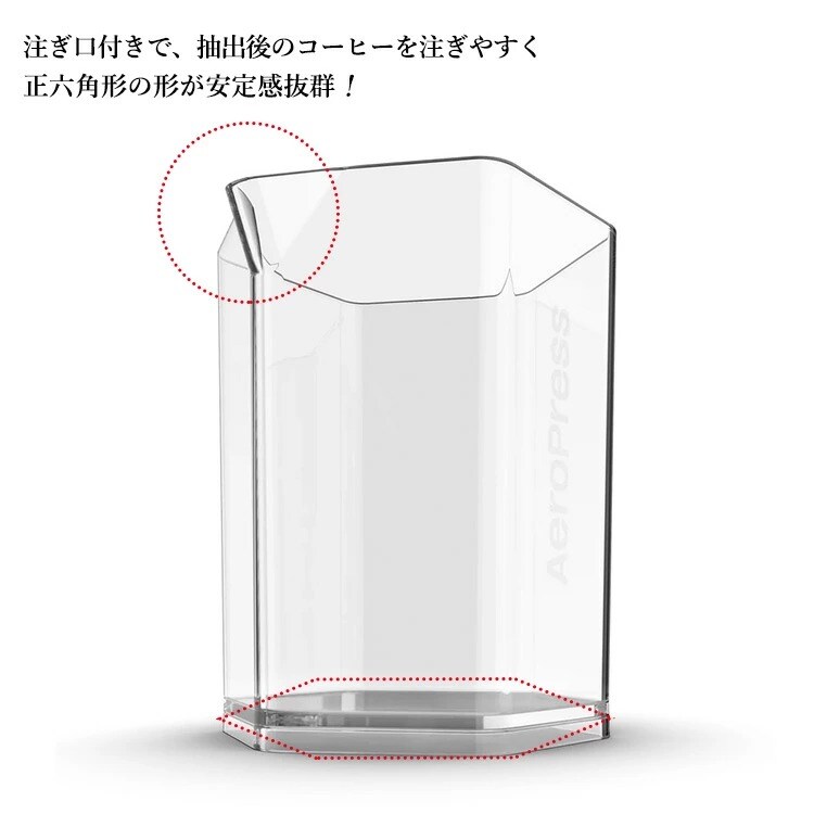 エアロプレス コーヒーメーカー専用に設計された、AeroPressRのロゴが入った公式のコーヒーサーバー。マグカップなどのサイズ感を気にせず、抽出できます。 六角形で安定しており倒れにくく、注ぎ口が付いているので注ぎやすいサーバーです。 ポイント1 抽出時にサイズ感などでカップを選ばずお好きなカップでコーヒーを楽しめます。複数カップへの提供も可能。 ポイント2 容量が大きいため、氷を入れたアイスコーヒーの抽出もできます。最大600mlまで使用可能。 ポイント3 透明な容器で、抽出シーンを視覚的にも楽しむことができ、AeroPress Rのロゴ入りでツールの統一感もうまれます。 ※本製品にエアロプレス コーヒーメーカー本体は、付属しておりません。 ※エアロプレスゴーにはご使用になれません。 |