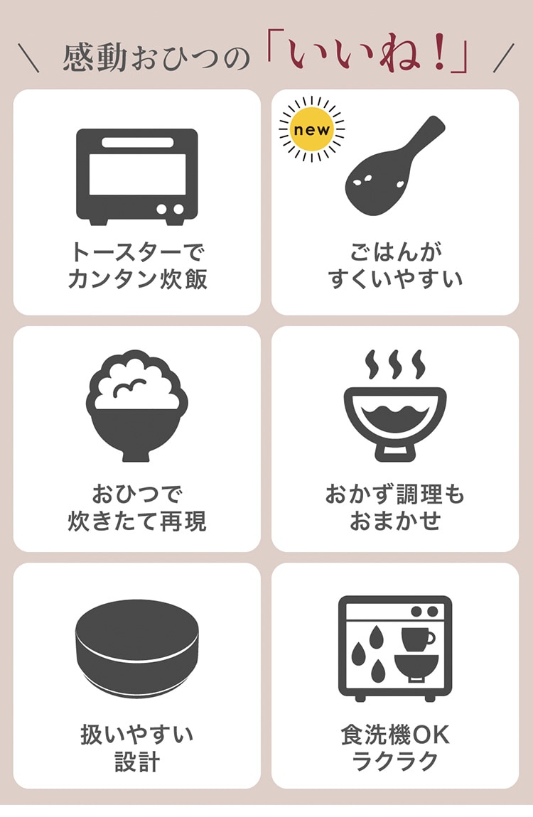 ● トースターで簡単・手軽に土鍋ごはん 家庭用トースター(1000W~1200W)で炊飯可能。 最短30分で炊きたてごはんが完成! ※上下ヒーター付きのトースターを推奨 ● 蒸気炊きでふっくらつやつや お米を動かさず、表面を傷つけない独自のスチーム炊飯。 まるで料亭のような、粒立ちの良いごはんに。 ● ごはんの保存もおまかせ 萬古焼の陶器が持つ調湿機能で、冷蔵庫保存したごはんも翌日ふっくら・ツヤツヤ! 電子レンジで温めるだけで、炊きたてのようなおいしさに。 ● おかず調理にも使える! 炊飯だけでなく、トースターやオーブンでの調理にも対応。 副菜や蒸し料理もこれ一つでOK。 ● 使いやすさにもこだわり ・食洗機対応でお手入れ簡単 ・すくいやすくなった形状 ・コンパクトで収納しやすい ・フラット蓋でスタッキングもOK |