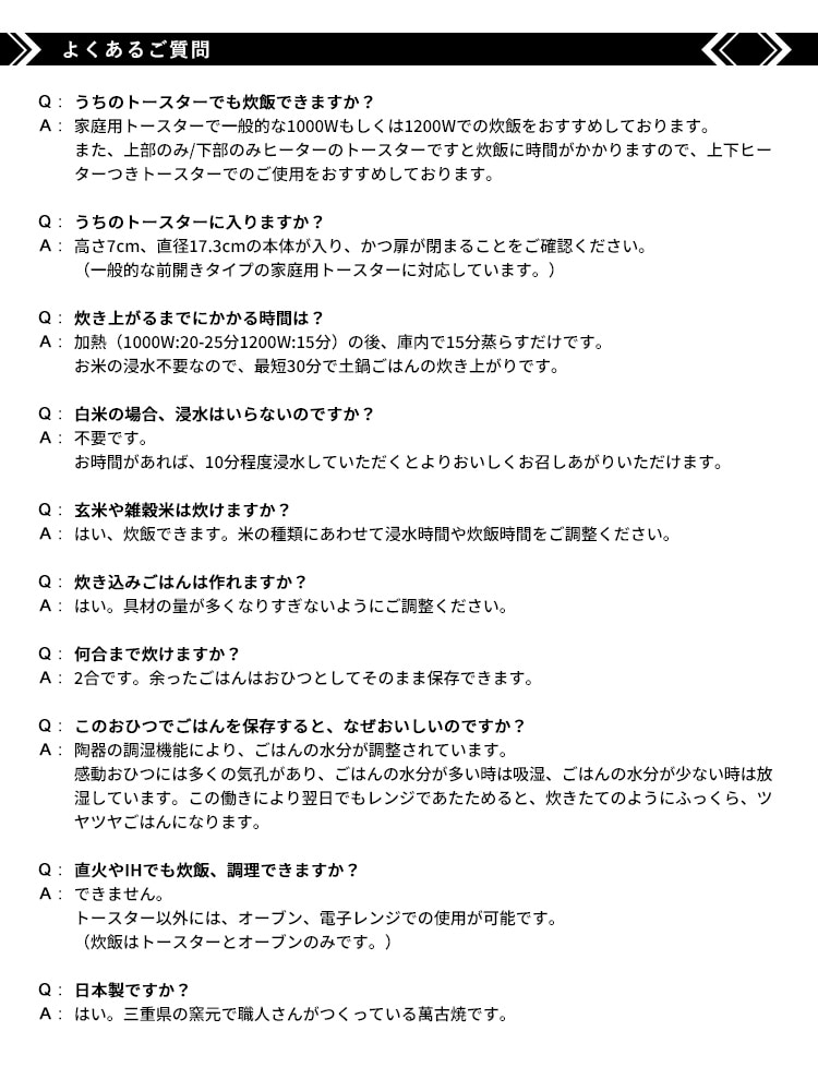 | 【正規販売店】トースターで土鍋ごはん!火加減いらずのほったらかし炊飯。蒸気で炊くから一粒一粒がきわだちます。おひつがご飯の水分を調整するから、翌日もまるで炊きたて! |