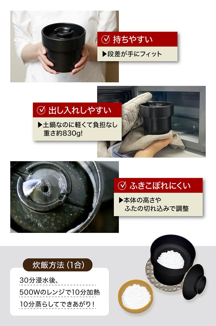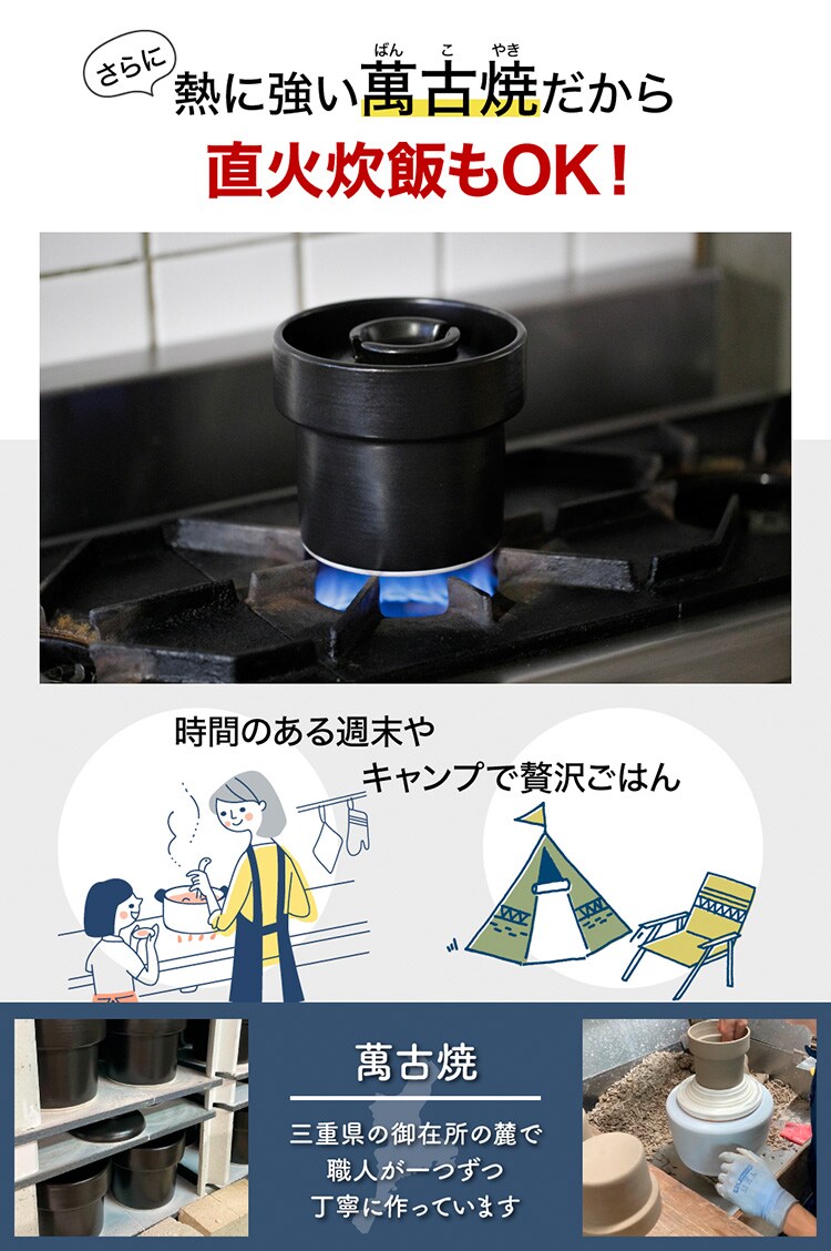 | 【正規販売店】お米とお水を入れて、電子レンジでたった10分!火を使わず、誰でもかんたんにごはんが炊ける土鍋。熱に強い萬古焼だから、直火での炊飯も可能。アウトドアにも便利。 |