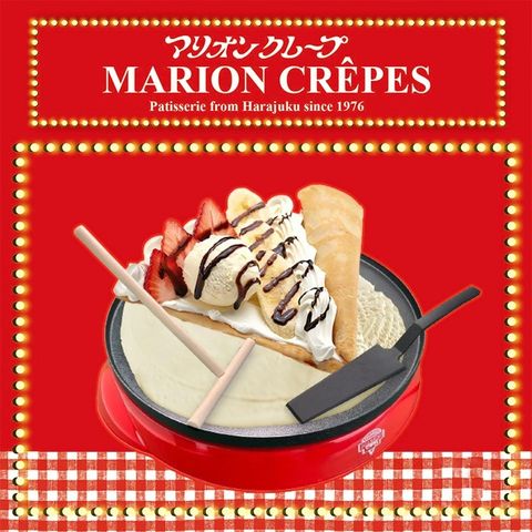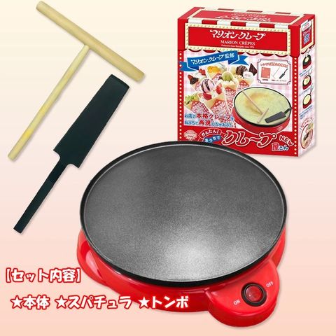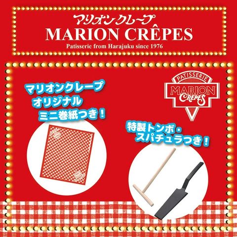 | 【正規販売店】マリオンクレープ監修、プロ仕様のトンボ&スパチュラやオリジナルミニ巻紙がセットになった本格クレープ作りセットです!誰でも簡単に、キレイなクレープが焼けます! |