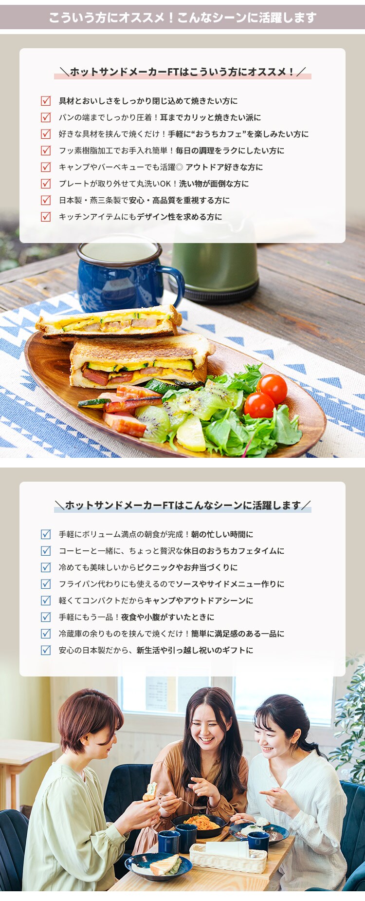 \手軽におうちカフェ気分♪はさんで焼くだけ/ 具材のうまみをギュッと閉じ込めて、外はカリッと中はふっくら。 フラットなデザインで使いやすく、お手入れも簡単。 毎日使いたくなる、こだわりのホットサンドメーカーです。 ● ムラなくカリッと焼ける 熱伝導に優れたアルミ製で、全体に均一に熱が伝わるから、耳までしっかりカリカリ。 パンのフチをしっかり圧着して、具材やうまみをしっかり閉じ込めます。 ● 両面フラットでお手入れラクラク 内側に凹凸がなく、フッ素樹脂加工で汚れがつきにくい! 焦げつきにくく、さっと洗えていつも清潔。 2枚のプレートは簡単に取り外せて、丸洗いOK。 フライパンとしても使えるので、キャンプなどのアウトドアにも◎ ● スッと外してパッと取り付け!使いやすさ抜群 上下のプレートはワンタッチで取り外し可能。 毎回の洗い物や収納がストレスになりません。 たったの758gと軽量なので、持ち運びにも便利です。 ● 【日本製・燕三条製】品質へのこだわり 職人の技術が光る、新潟県・燕三条製。 確かな品質で、長く安心してお使いいただけます。 PFOA・PFOSフリーで、安心・安全にも配慮。 |