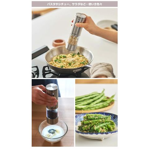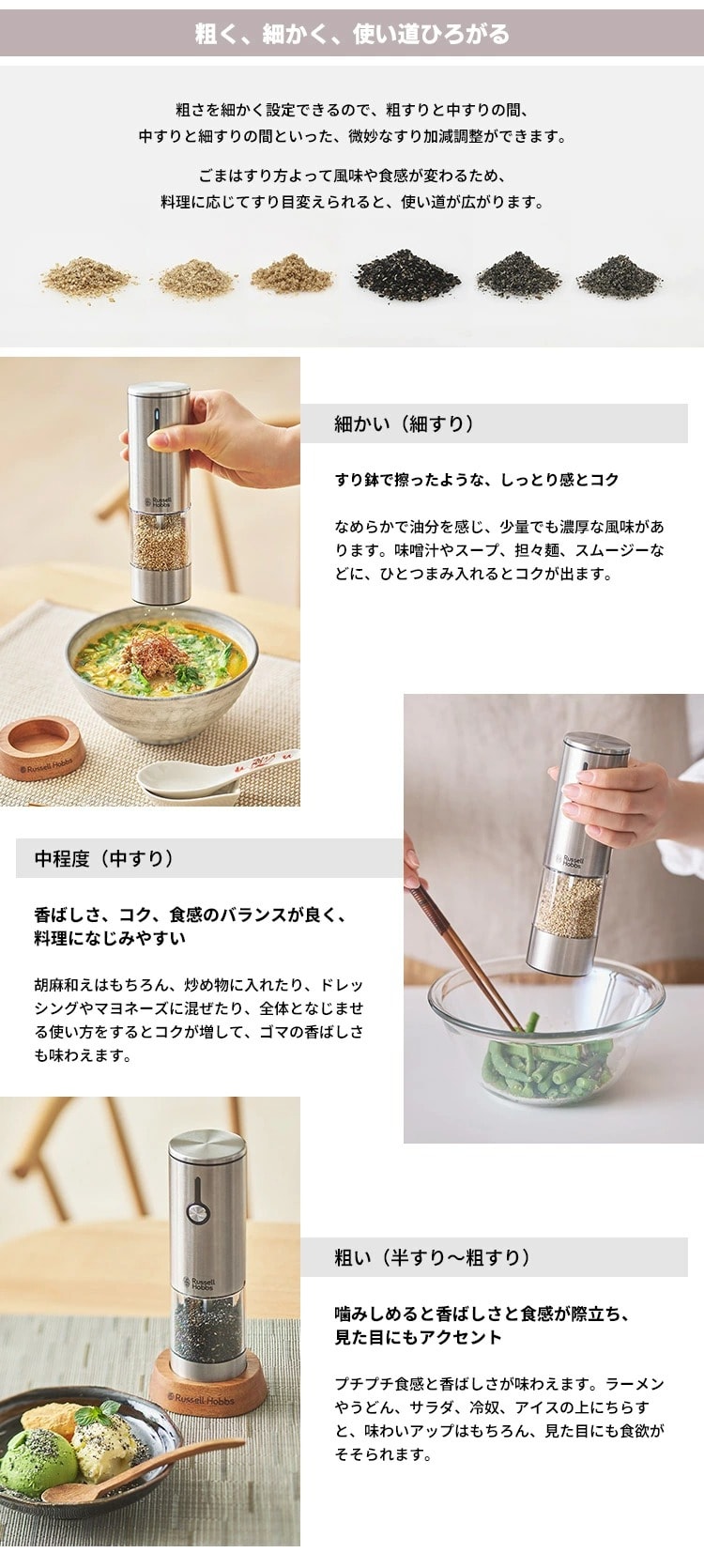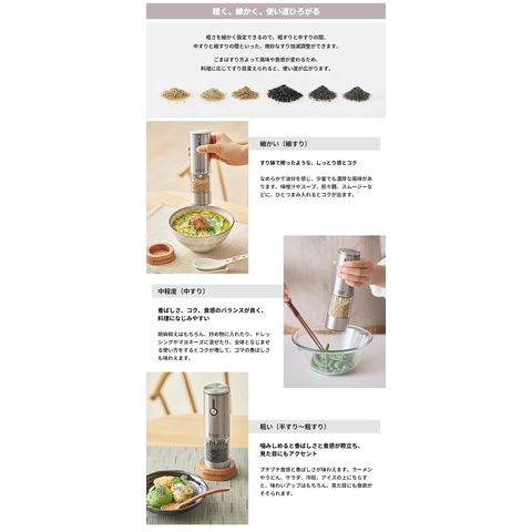 粗さを細かく設定できるので、粗すりと中すりの間、中すりと細すりの間といった、微妙なすり加減調整ができます。 ごまはすり方よって風味や食感が変わるため、料理に応じてすり目変えられると、使い道が広がります。 ● 細かい(細すり) “すり鉢で擦ったような、しっとり感とコク” なめらかで油分を感じ、少量でも濃厚な風味があります。味噌汁やスープ、担々麺、スムージーなどに、ひとつまみ入れるとコクが出ます。 ● 中程度(中すり) “香ばしさ、コク、食感のバランスが良く、料理になじみやすい” 胡麻和えはもちろん、炒め物に入れたり、ドレッシングやマヨネーズに混ぜたり、全体となじませる使い方をするとコクが増して、ゴマの香ばしさも味わえます。 ● 粗い(半すり~粗すり) “噛みしめると香ばしさと食感が際立ち、見た目にもアクセント” プチプチ食感と香ばしさが味わえます。ラーメンやうどん、サラダ、冷奴、アイスの上にちらすと、味わいアップはもちろん、見た目にも食欲がそそられます。 |