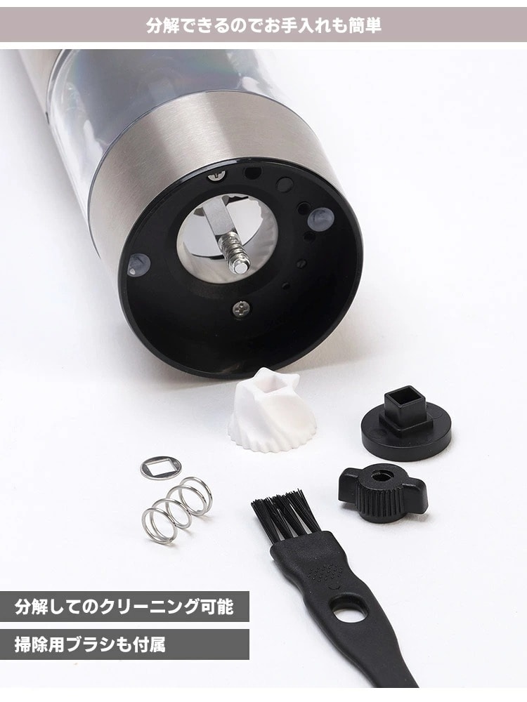 ● LEDで手もとを明るく 上部のボタンを押している間はLEDライトが点灯。分量が見やすく、手元が暗いときに便利です。 ● セラミック製の臼 錆の心配がなく、酸化の影響を受けにくいセラミック製の刃を採用。 摩擦熱も生じにくいため、熱で飛びやすいゴマの香りを保ちます。 ● 電池を使わない充電式 充電式で、乾電池を何本も搭載する必要がないため本体は軽めです。 交換用乾電池の補充や廃棄のストレスも無く、長期的にはコストダウンにもなります。 また、USBポートはスライド式カバーでおおわれているので、ほこりの侵入やポートカバー紛失の心配がありません。 ● ミルの転倒を防ぐウッドスタンド このウッドスタンドにミルを立てることによって、ミルの転倒を防ぎます。 また、ミルは挽いた後に、どうしても粉がわずかにこぼれるので、受け皿の役割にもなります。 |