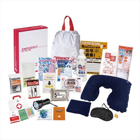 ■商品素材・機能:非常持出袋/ポリエステル 非常用持出袋・IDホイッスル&カラビナリング・ウエットティッシュ(日本)・マスク・静音アルミブランケット・防災の心得(日本)・懐中電灯・5年保存水500ml(日本)・給水袋3L(タイ)・カイロ(日本)・レインコート・抗菌消臭簡易トイレ(日本・中国)・ネックピロ