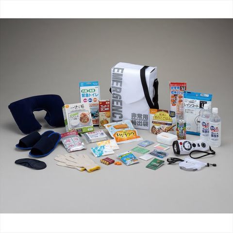 ■商品素材・機能:防災ショルダーバッグ/ポリエステル 防災ショルダーバッグ(ベトナム)・防災セットに入れておくと便利な「明るいラジオライト」・長期保存アルカリ単3×4(日本)・あんしん保存水500ml×2(日本)・ひだまりパンプレーン(日本)・野菜一日これ一本(日本)・きのこご飯(日本)・ライスクッキーココナッツ(