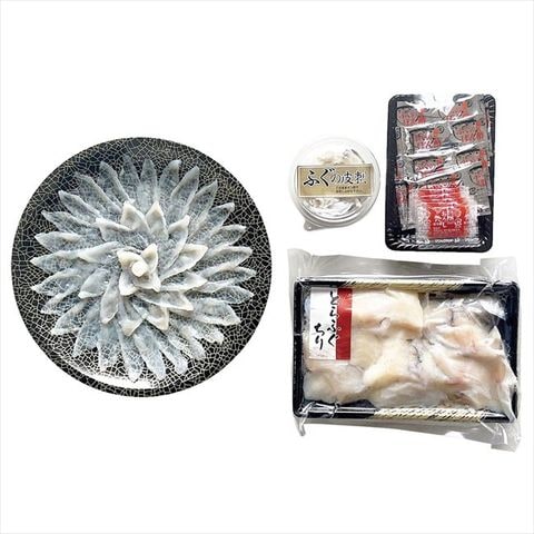 ◆商品内容:とらふぐ刺身65g、とらふぐ皮40g、とらふぐちり250g、ポン酢15g×5、もみじおろし3g×5
