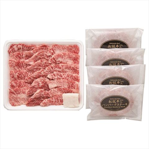 ◆商品紹介:鮮やかな紅色できめ細やかな美しい霜降りに「肉の芸術品」と称賛される松阪牛の焼肉と松阪牛の美味しさを味わえるハンバーグ、あふれる肉汁と、松阪牛の風味をお楽しみ頂けます。