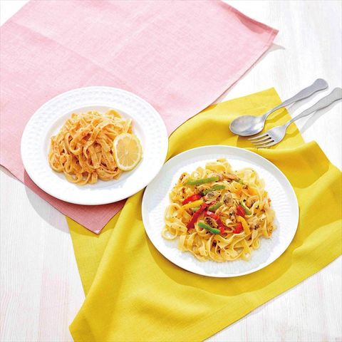 ◆商品紹介:もつもちのフィットチーネ麺を、電子レンジで簡単に調理できます。明太子をたっぷり使用した明太アヒージョと明太クリームソースの2種類をお楽しみ頂けます。
