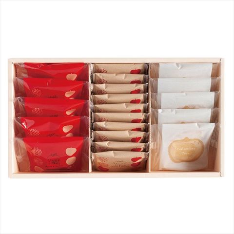 ◆商品紹介:しっとりしたりんごのフィナンシェとサクサク食感のりんごのクッキー、りんご型のチョコレートタルト、3種類のりんごのお菓子がセットになったギフト。