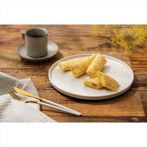 ◆商品紹介:程よい薄さに焼き上げたしっとり食感のクレープ生地。黄桃、パインを加えたムースをクレープ生地で包みました。フルーツのさわやかな酸味が特徴の、甘さ控えめなクレープです。