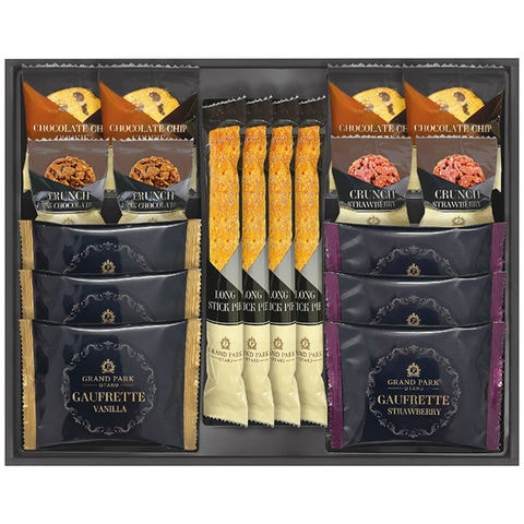■商品内容:ロングスティックパイ・チョコチップクッキー各4個・ゴーフレット(バニラ・ストロベリー各3個)・チョコクランチ(ストロベリー・ミルク各2個)