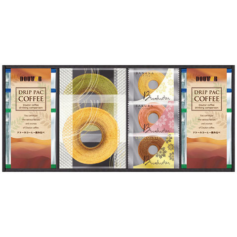 ■商品内容:ドトールコーヒー(深煎りブレンド7g×4袋・キリマンジャロブレンド7g×2袋)・バウムクーヘン(ミルク・宇治抹茶)・ミニバウムクーヘン(桜・バナナ・ベルギーショコラ)各1個