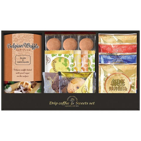 ■商品内容:銀座澤井珈琲ドリップコーヒー(ゴールドブレンド8g×2袋・ルビーブレンド8g・ブレンドアクア8g各1袋)・クリームモンブランクッキー3個・ラスク(シュガー・セサミ各1個・バナナ2個)・ベルギーワッフル(プレーン2個・ショコラ1個)・ベイクドドーナツ(プレーン・ショコラ各1個)