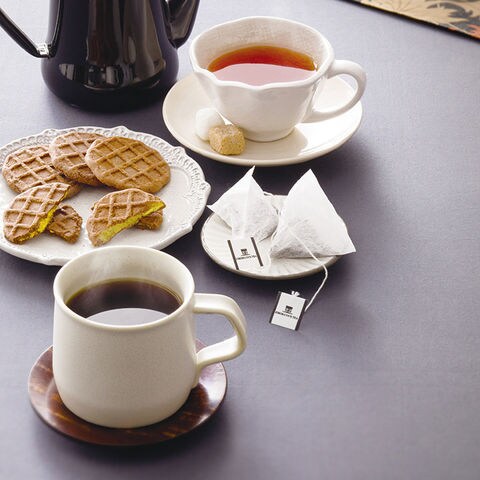 ■商品内容:ドリップコーヒー(エクセレントブレンド・クラシックブレンド各7g×4袋)・ティーバッグ紅茶ダージリン2g×4袋・ワッフルクッキー(抹茶・スイートポテト各2個)