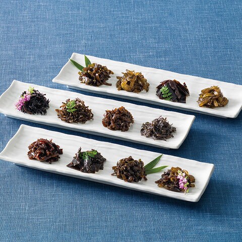 ■商品内容:ごま昆布45g・椎茸昆布45g・しその実わかめ45g・汐吹昆布20g・山椒昆布45g・ひじき椎茸45g・わかめ佃煮45g・椎茸入甘煮わかめ45g・鰹入わかめ昆布50g・わかめ木耳50g各1個