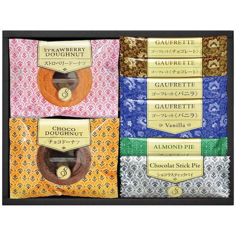 ■商品内容:ゴーフレット(チョコ・バニラ各2枚)・パイ(アーモンド・ショコラスティック)・焼ドーナツ(チョコ・ストロベリー)各1枚