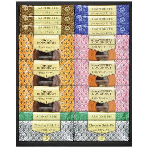 ■商品内容:ゴーフレット(チョコ・バニラ各3枚)・パイ(アーモンド・ショコラスティック各2枚)・焼ドーナツ(チョコ・ストロベリー各3枚)