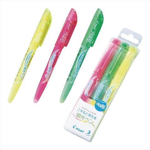 摩擦による温度変化でインキが無色に!消せるフリクション蛍光ペンの3色セットです。