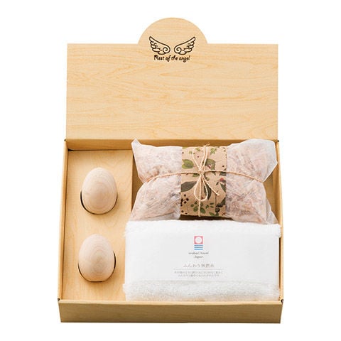 ■商品内容:檜タマゴ/径4.2×H5.2cm×2 檜バッグ/16×11×H2cm×1 檜 ウォッシュタオル/34×36cm×1 綿100% 化粧箱/21.5×24.2×4.7cm 原産国:日本