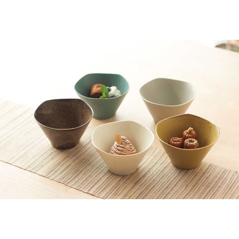 ■商品紹介:シンプルなくすみカラーの色合いと波状のオリジナリティがかわいいボウルセット。