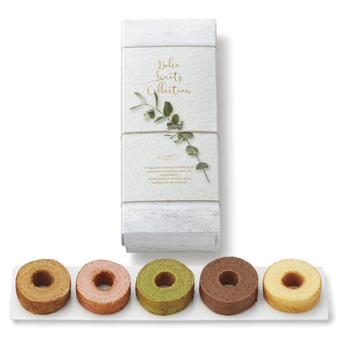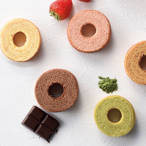 ■商品内容:ミニバウム(バニラ・チョコ・抹茶・ストロベリー・キャラメル)×各1 化粧箱/27.5×11×7cm 原産国:日本