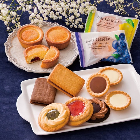 ■商品内容:ロシアケーキ(マカロンストロベリ―・リッチビター各1個・フラワーキウイ2個)・プチガトー(ミルクチョコ・ホワイトチョコ各3個)・ソフトガトー(ヨーグルト&ブルーベリー・チーズ&レモン各3個)