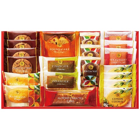 ■商品内容:オレンジマドレーヌ・ピスタチオフィナンシェ各2個・ブラウニー3個・ケーキ(ストロベリーショコラ3個・ブラウンシュガーパウンド・アーモンドキャラメル各1個)・クッキー(チョコチップ・レモン各4個)