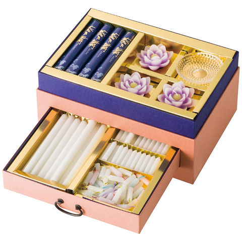 ■商品内容:長さ2.6cm五色蝋燭38g×1袋・直径5.8cm高さ2.8cm蓮ローソク小20g×3個・長さ14.2cm菜100分ろうそく16本・長さ4.2cm菜15分ろうそく48本・長さ13.5cm葵乃舞線香束26g×4束・直径7.5cm高さ2cm燭台1個・ガラス・線香[日本製]・蓮ローソク、五色蝋燭[ベトナム製]・菜100、菜15[マレーシア製]・燭台[中国製]
