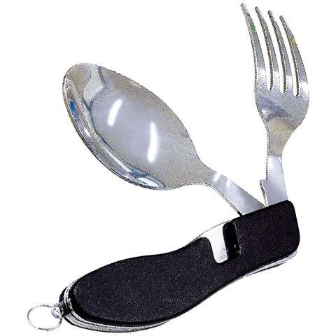 ■商品紹介:スプーンとフォークが一体に。コンパクトに折りたためて持ち運びに便利。分解できるのでスプーンもフォークも同時に使えます。アウトドアや防災用品に。