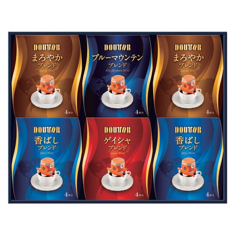 ■商品内容:ドリップコーヒー(8g×4p)×6(まろやかブレンド・香ばしブレンド×各2、ゲイシャブレンド・ブルーマウンテンブレンド×各1)
