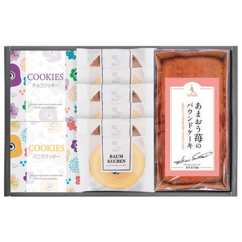 ■商品内容:あまおう苺パウンドケーキ、バウムクーヘン(バニラ・ココア×各3)、バニラクッキー30g箱入、チョコクッキー30g箱入