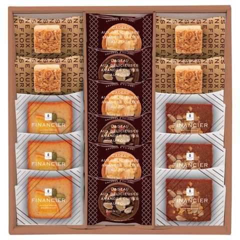 ■商品内容:フィナンシェ×6(オレンジ・キャラメルアーモンド×各3)、フロランタン×4、タルト×6(ブラウニー・ホワイトブラウニー×各3)