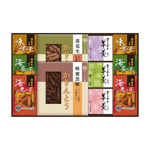 ■商品紹介内容/蜂蜜黒糖かりんとう:40g×1・落花生かりんとう:40g×1・あられ(海老):12g×2・あられ(海苔):12g×2・あられ(味噌):12g×2・羊かん(抹茶):60g×1・羊かん(練り):60g×1・羊かん(小倉):60g×1《小麦・落花生・えび》
