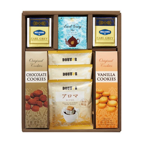 ■商品紹介内容/ドトールドリップコーヒーアロマブレンド[日本製]:7g×3・アールグレイ紅茶ティーバッグ(NELSONS)[スリランカ製]:2g×12・アールグレイ紅茶ティーバッグ[スリランカ製]:2g×5・チョコクッキー[日本製]:30g×1・バニラクッキー[日本製]:30g×1《卵・乳・小麦》