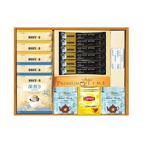 ■商品紹介内容/ドトールドリップコーヒー(アロマブレンド)×3・ドトールドリップコーヒー(深煎りブレンド)×2・リプトンイエローラベル×3・アールグレイ紅茶ティーバッグ×6・ドトールインスタントスティック(ブラック)×6・スティックシュガー:15本×1