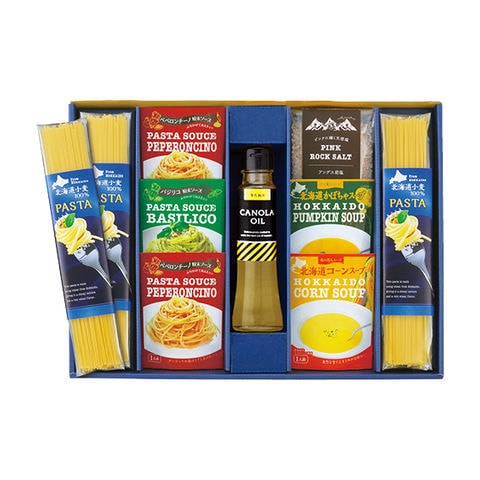 ■商品紹介内容/北海道小麦のパスタ[日本製]:80g×3・北海道コーンスープ[日本製]:16.5g×1・パスタシーズニング(ペペロンチーノ)[日本製]:3g×2・アンデスのピンク岩塩[ボリビア製]:30g×1・北海道かぼちゃスープ[日本製]:16.5g×1・パスタシーズニング(バジリコ)[日本製]:3g×1・キャノーラ油[日本製]:90g×1《卵・乳・小麦》