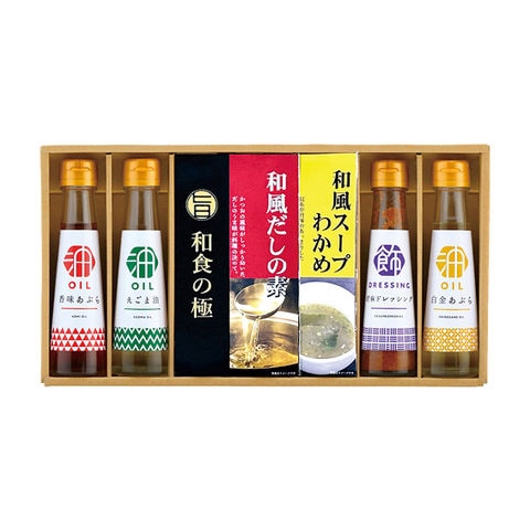 ■商品紹介内容/香味あぶら:90g×1・えごま油:90g×1・和風だしの素:4g×3・わかめスープ:7g×2・胡麻ドレッシング:100ml×1・白金あぶら:90g×1《乳・小麦》