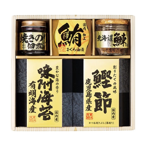 ■商品紹介内容/鰊フレーク:50g×1・焼きのり佃煮:85g×1・鹿児島県産鰹節:2g×3袋×1・有明海産味付け海苔8切10枚×1・まぐろ油漬け:70g×1《小麦・えび》
