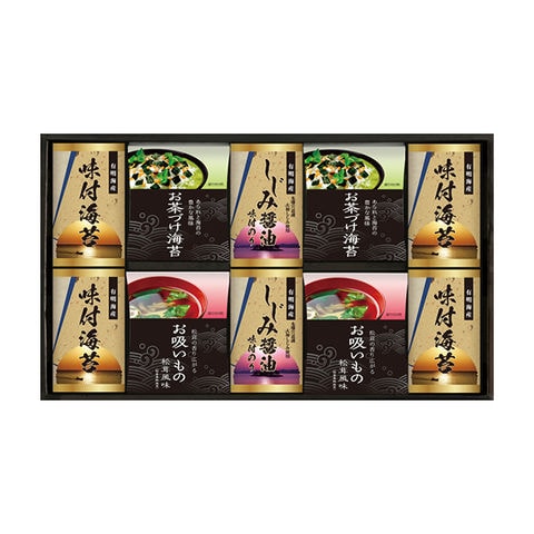 ■商品紹介内容/永谷園お茶づけ海苔:4.7g×5袋×2・永谷園お吸いもの松茸風味:2.3g×6袋×2・有明海産味付海苔:10切20枚×4・しじみ醤油味付海苔:10切20枚×2《小麦》