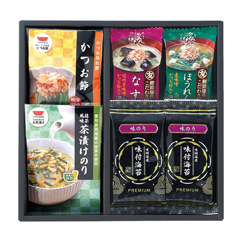 ■商品紹介内容/鰹節:1.5g×2袋×1・抹茶入りのり茶漬け:5.6g×2袋×1・即席みそ汁(なす):7.4g×1・即席みそ汁(ほうれん草):7.5g×1・有明海産味付海苔:8切5枚×2《小麦・えび》