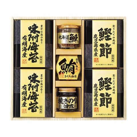 ■商品紹介内容/鰊フレーク:50g×1・焼きのり佃煮:85g×1・鹿児島県産鰹節:2g×3袋×2・有明海産味付け海苔8切10枚×2・まぐろ油漬け:70g×1《小麦・えび》