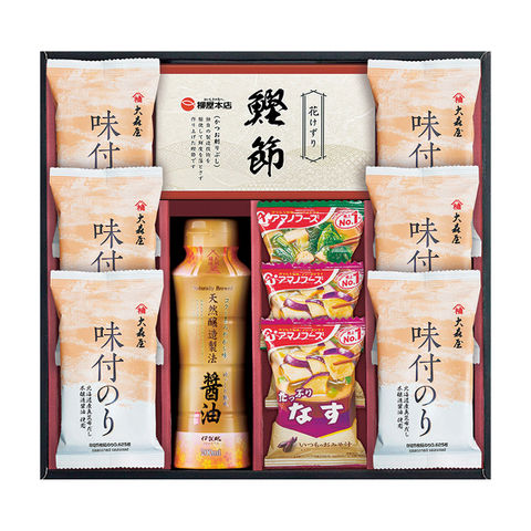 ■商品紹介内容/天然醸造?油:200ml×1・アマノフーズいつものおみそ汁(なす)×2・アマノフーズいつものおみそ汁(ほうれん草)×1・大森屋味付のり:8切5枚×6・柳屋本店かつおパック:3g×3袋×1《小麦・えび》