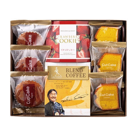 ■商品紹介内容/坂井宏行シェフ監修(ドリップコーヒーモカブレンド×1・ドリップコーヒーブラジルブレンド×1・ドリップコーヒーキリマンジャロブレンド×1)・カップケーキ(メープル)×3・イチゴクッキー:50g×1・カットケーキ(レモン)×3《卵・乳・小麦》