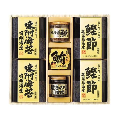■商品紹介内容/鰊フレーク:50g×1・焼きのり佃煮:85g×1・鹿児島県産鰹節:2g×3袋×2・有明海産味付け海苔8切10枚×2・まぐろ油漬け:70g×1《小麦・えび》