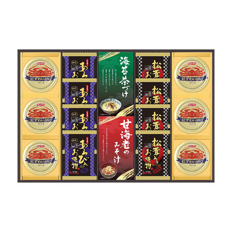 ■商品紹介内容/あわび入お吸い物:4g×4・松茸入りお吸い物:4.2g×4・紅ずわいがにほぐし身:55g×6・甘海老みそ汁:7.5g×2袋×1・丸美屋のり茶漬け:6g×4袋×1《卵・乳・小麦・かに》