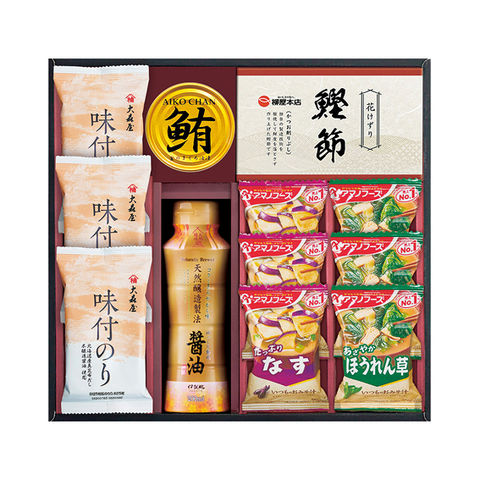 ■商品紹介内容/天然醸造?油:200?×1・アマノフーズいつものおみそ汁(なす)×3・アマノフーズいつものおみそ汁(ほうれん草)×3・大森屋味付のり:8切5枚×3・柳屋本店かつおパック:3g×3袋×1・鮪油漬けフレーク:70g×1《小麦・えび》