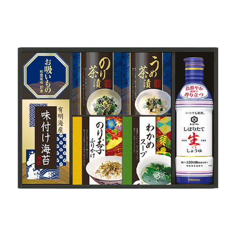 ■商品紹介内容/永谷園お吸いもの松茸風味:2.3g×2袋×1・有明海産味付け海苔:8切4枚×2袋×1・のり茶漬け:4.3g×2袋×1・うめ茶漬け:4.3g×2袋×1・のり玉子ふりかけ:4.5g×2袋×1・わかめスープ:5.3g×2袋×1・キッコーマンしぼりたて生しょうゆ:450ml×1《卵・乳・小麦・えび》