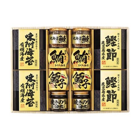 ■商品紹介内容/鰊フレーク:50g×2・焼きのり佃煮:85g×2・鹿児島県産鰹節:2g×3袋×2・有明海産味付け海苔8切10枚×2・まぐろ油漬け:70g×2・鱈之子味付け:70g(固形量45g)×2《小麦・えび》