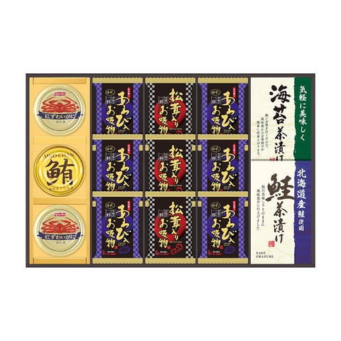 ■商品紹介内容/あわび入お吸い物:4g×6・松茸入りお吸い物:4.2g×3・紅ずわいがにほぐし身:55g×2・鮪油漬フレーク:70g×1・北海道産鮭茶漬け:4g×2袋×1・丸美屋のり茶漬け:6g×2袋×1《卵・乳・小麦・かに》